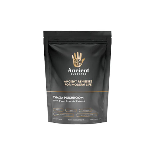 Introducing Ancient Extracts' Organic Chaga Powder, a 60-gram powerhouse enriched with 30% beta-glucan. Carefully sourced from organically cultivated Chaga mushrooms, this premium dietary supplement exemplifies nature's purity and efficacy. Meticulously crafted to the highest quality standards, Ancient Extracts guarantees a product that promotes overall well-being. Offering energy boosting properties. Elevate your health with this potent organic supplement, as Ancient Extracts invites you to embrace the benefits of Chaga – your gateway to holistic vitality.