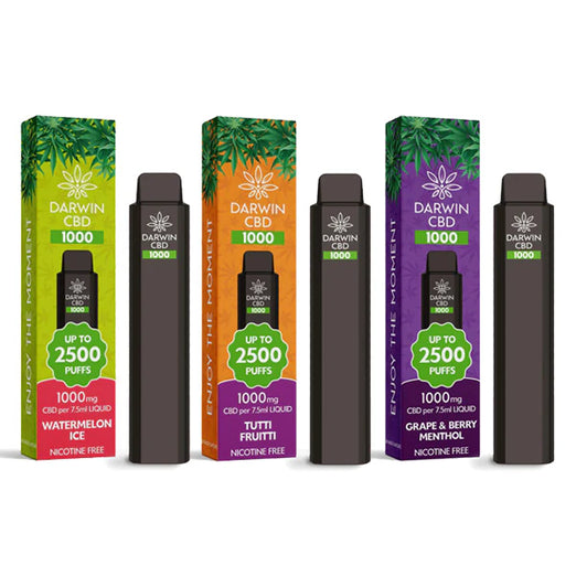 Pre-filled with 7.5ml of nicotine free CBD e-liquid, each Darwin CBD 1000 flavour will last up to 2500 puffs allowing you to savour the various great tastes on offer that's fully TPD Complaint. Each flavour has an integrated mesh coil that allows for pure, extraordinary flavours to be experienced.